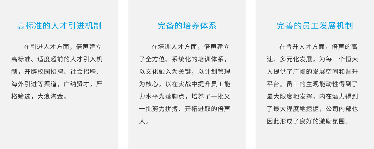 人才是企業發展的根本,是推動企業跨越式發展的第一生產力。倍聲重視團隊建設,多渠道引進人才、高效機制培養人才、廣闊平臺晉升人才,為企業在激烈競爭中立于不敗之地提供強有力的保障。